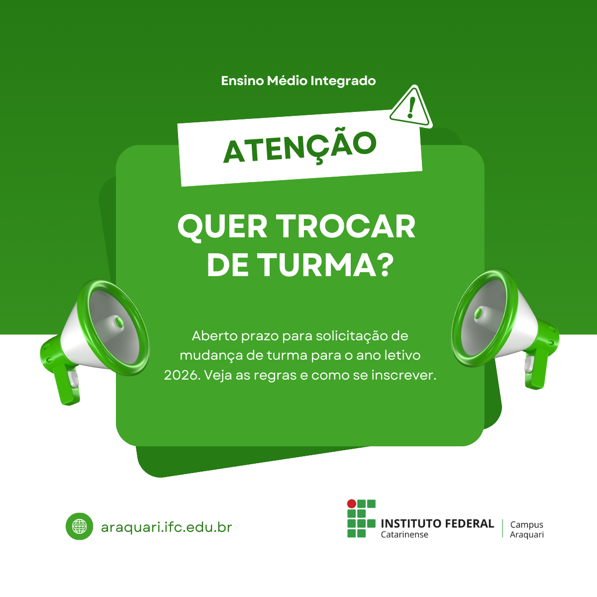 Você está aqui: Página inicial > Portal do campus Campus Araquari - IFC - Instituto Federal Catarinense > Notícias > Aberto prazo para pedidos de troca de turma para cursos técnicos