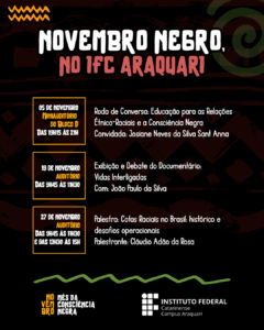 Em alusão ao Mês da Consciência Negra, o Instituto Federal Catarinense (IFC) – Campus Araquari, por meio do Núcleo de Estudos Afro-brasileiros e Indígenas (NEABI), realizará o “Novembro Negro 2025”, uma série de atividades voltadas à reflexão, valorização e fortalecimento das relações étnico-raciais.